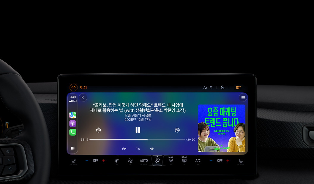 • 800여 개 자동차 모델에서 CarPlay를 통해 iPhone을 차량 내장 디스플레이에 연결할 수 있습니다. 그러면 차량의 터치 스크린 또는 Siri를 이용해 팟캐스트를 편하게 청취할 수 있죠. 일부 차량 모델의 경우 ‘팟캐스트’ 앱이 기본 설치되어 있습니다.