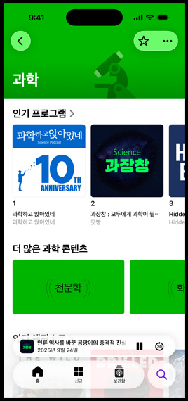 새로운 관심사를 발견하고, 지금 주목받고 있는 주제들을 놓치지 않고 만나볼 수도 있죠. 저명인사부터 인디 방송인까지, 당신이 좋아하는 주제를 다룬